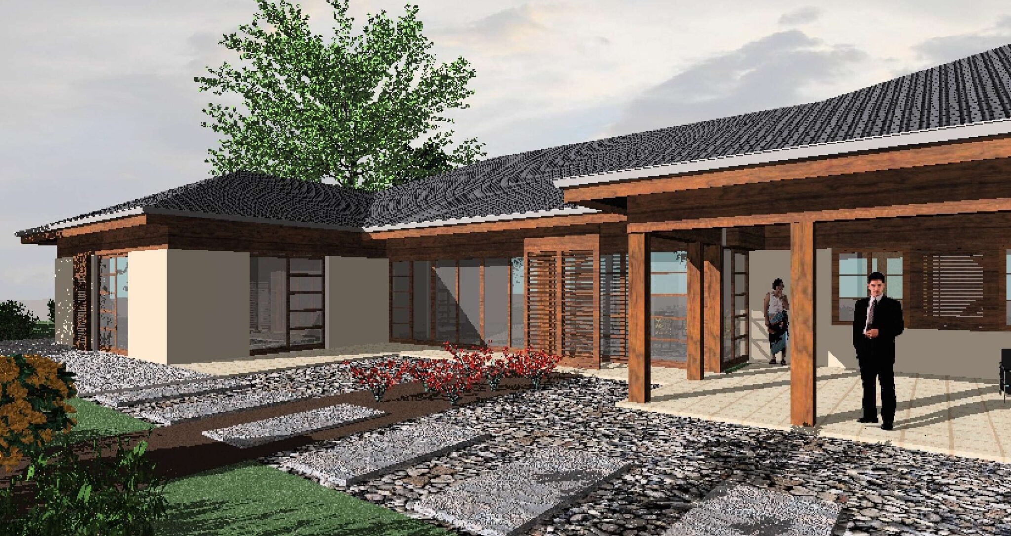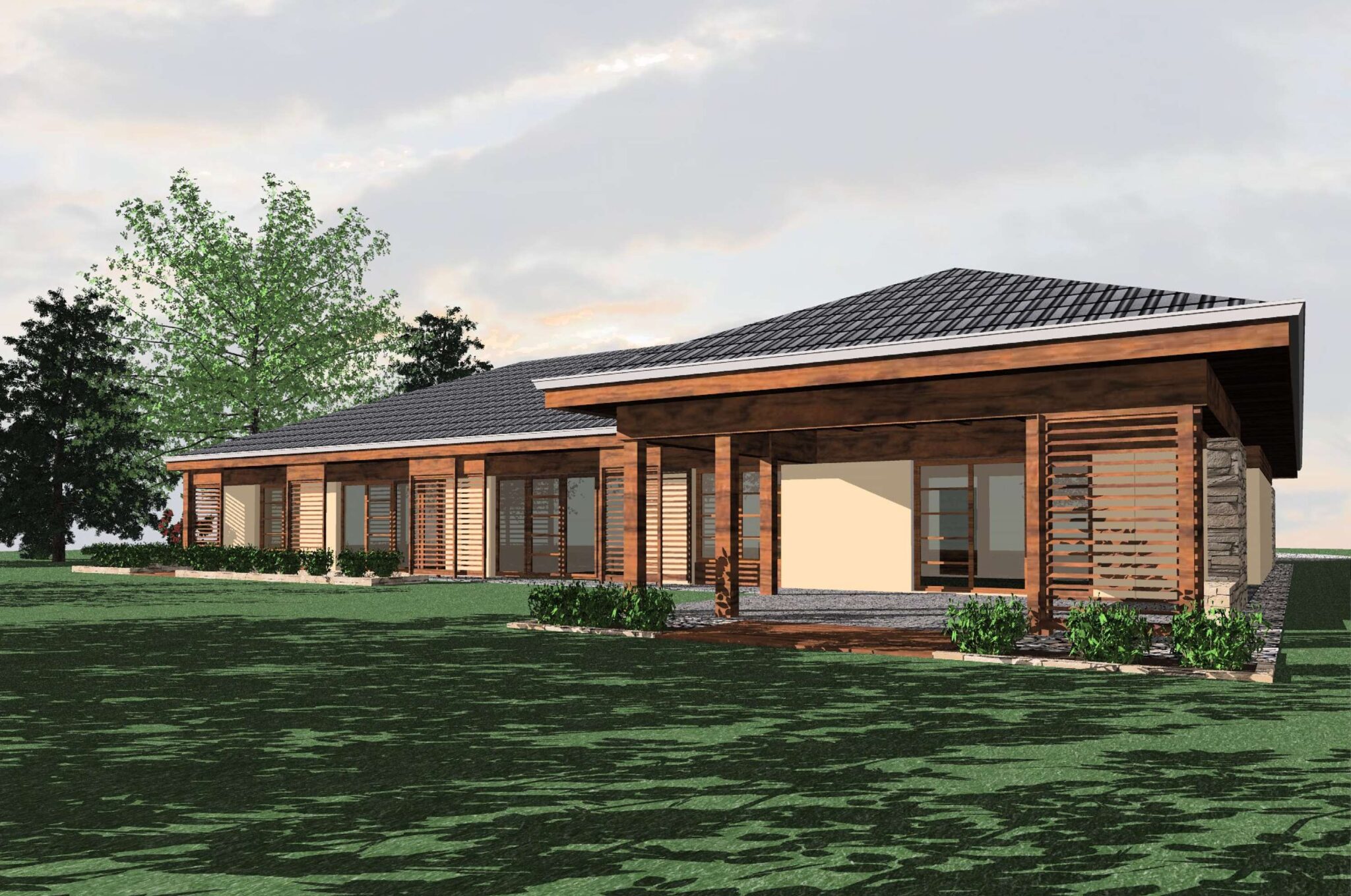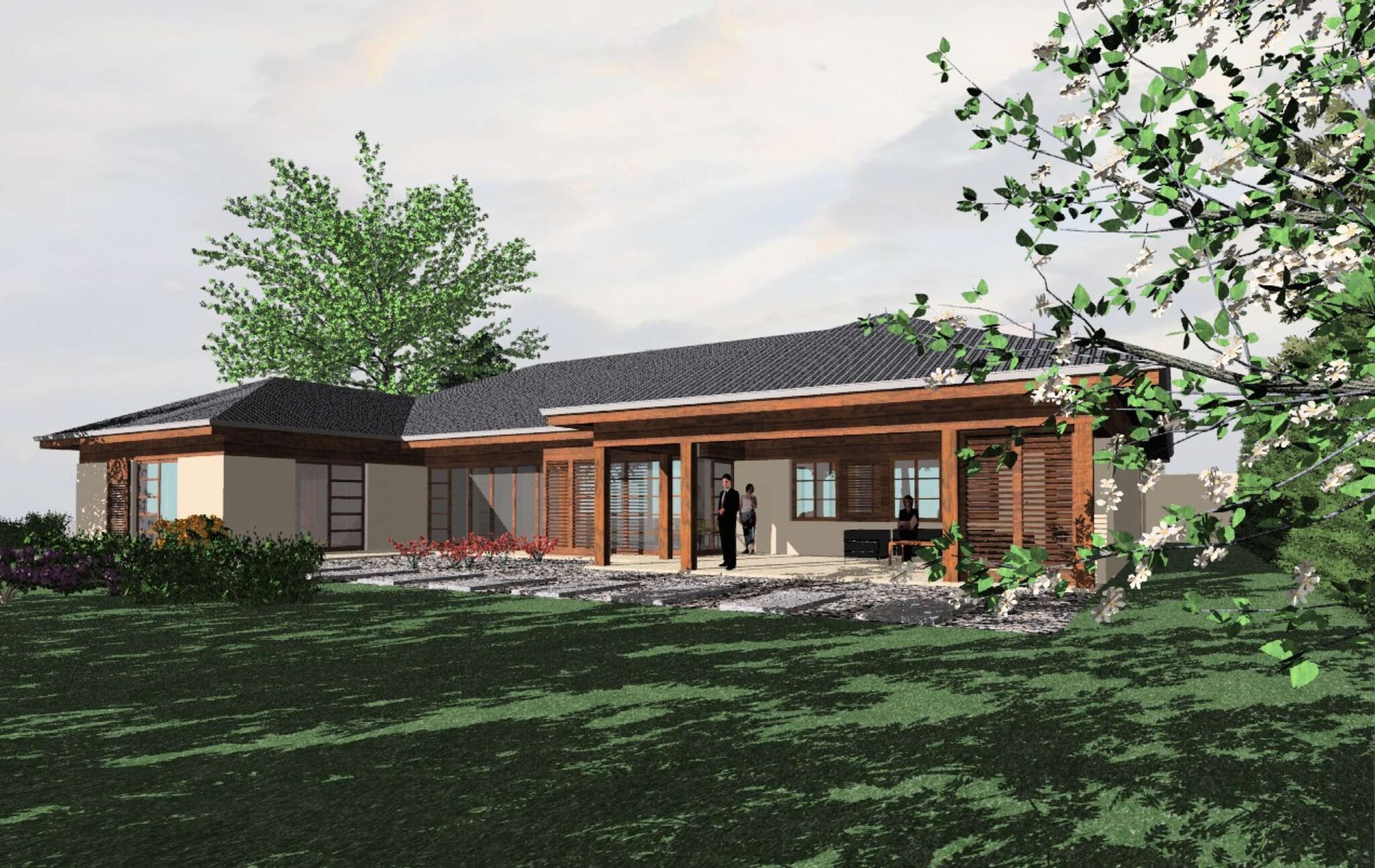 Elegancka parterowa willa z zadaszonym tarasem.